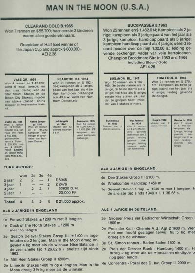 De bruine hengst MAN IN THE MOON is geboren op 27 februari 1974 en werd gefokt door de heer Mellon, USA. Hij kwam voort uit fantastische bloedlijnen met grote namen: van Buckpasser uit een dochter van Nearctic. Voor zijn stamboom: zie onderaan deze pagina.