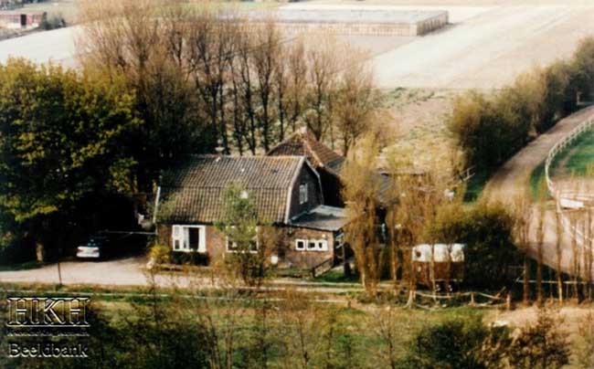Boven: Deze foto vonden wij op de Beeldbank van de Historisch Kring van Heemskerk. In het woonhuis woonden Aad en Elly links en zijn ouders rechts. Achter het woonhuis staat een kapberg met de stallen voor de paarden. Rechts zien we een gedeelte van de trainingsbaan en een paardentrailer. Het hele complex en de bollengrond daarachter is nu ingenomen door de woonwijk de Waterakkers aan de noord-west kant van Heemskerk.