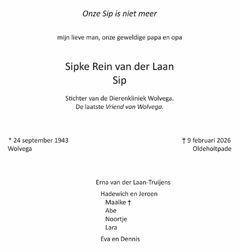 Sip van der Laan is overleden