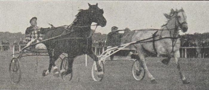 Boven: In de 4e heat van het Kampioenschap van Nederland mochten reglementair alleen de winnaars van de eerste 3 heats meedoen. Emma Harvester kwam dus niet aan de start, tot grote teleurstelling van de Hollanders. Zoals gebruikelijk nam Marten Siderius met zijn Henriot de leiding en op het laatste rechte stuk kwam Nora Belwin B ernaast. Beide paarden vochten een verbeten strijd uit, die door Nora (rechts) met een neuslengte werd gewonnen in 1.26,4. Een Heroïsch Gevecht. Het publiek was uitzinnig van spanning, enthousiasme en blijdschap. De Noorderlingen hadden op eigen terrein gewonnen. De Franse westerling Tourterelle kwam er niet aan te pas.