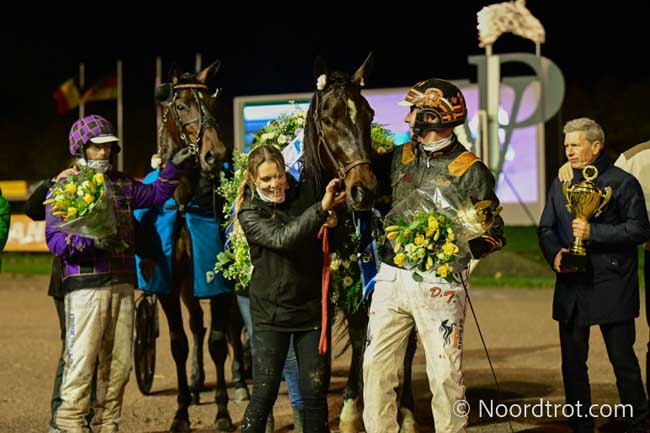 Newport en Dion Tesselaar en rechts Peter ter Borgh, de fokker-eigenaar