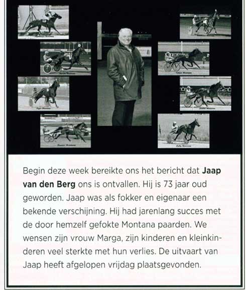 Jaap van den Berg uit Zandvoort was een groot liefhebber van de drafsport en de fokkerij. Hij fokte sinds het begin van de jaren 90 tientallen harddravers met de achternaam Montana en hield ze meestal zelf om ermee te koersen. Zijn trainers waren eerst Jan Wagenaar en later Tom Kooyman. Jaap's beste paard was de in 1993 geboren Duits gefokte Kilimanjaro Montana met een winsom van 154.372 Euro, die in training stond bij Jan Wagenaar.