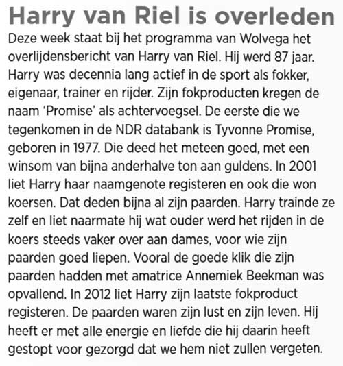 In 2018 kondigde Harrie van Riel al eens aan dat hij ging stoppen. Stiekem heeft hij er toch nog een jaartje bij aan geplakt, maar inmiddels kan er een streep worden gezet onder de drafsportcarrière van Harrie. Op de slotmeeting van Alkmaar op 29-12-2019 liep Gypsy Promise haar laatste koers voor de liefhebber uit de polder. "De gezondheid neemt wat af en dat is de voornaamste reden dat ik stop. lk heb last van duizeligheid en ben door een longembolie wat kortademig geworden. Komende zomer word ik 82 jaar. Het is mooi geweest". zegt Harrie van Riel.