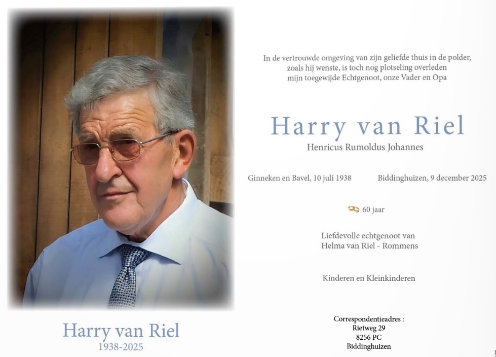 Zes jaar na bovenstaand artikel is Harrie van Riel op 87-jarige leeftijd overleden.