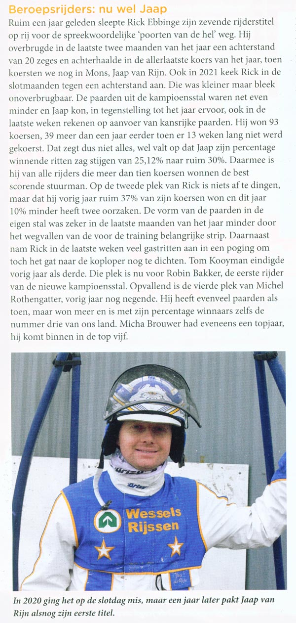 In de onderstaande lijst staat nog een foutje. Doeke Couperus kreeg als fokker van de Breeders Crown-winnares Karola nog 5 % extra fokpremie (geen 15 % maar 20 %), ten bedrage van 375 Euro. Hij totaliseerde daardoor 3.282 Euro, waardoor hij is opgeschoven van de 12e naar de 7e plaats.